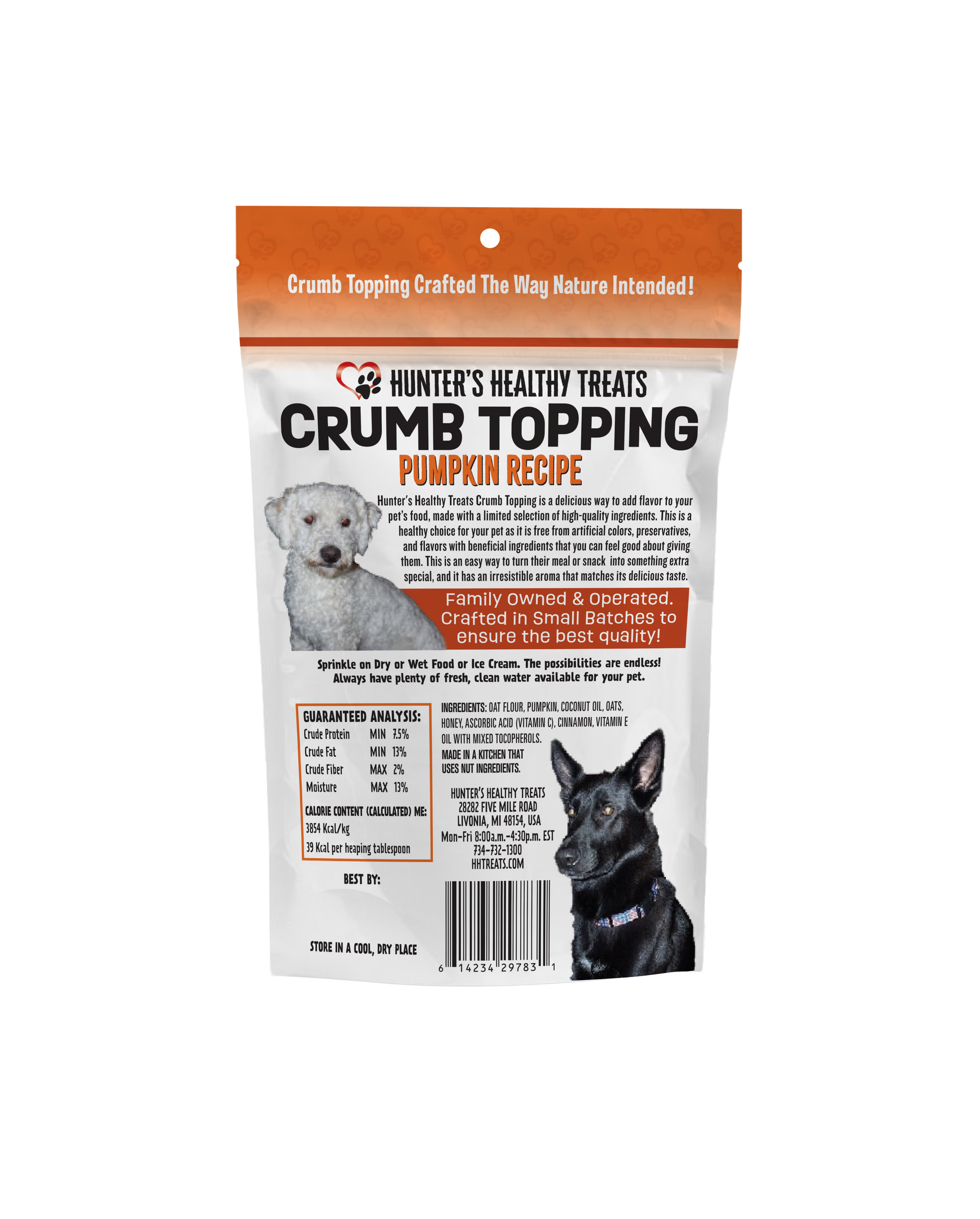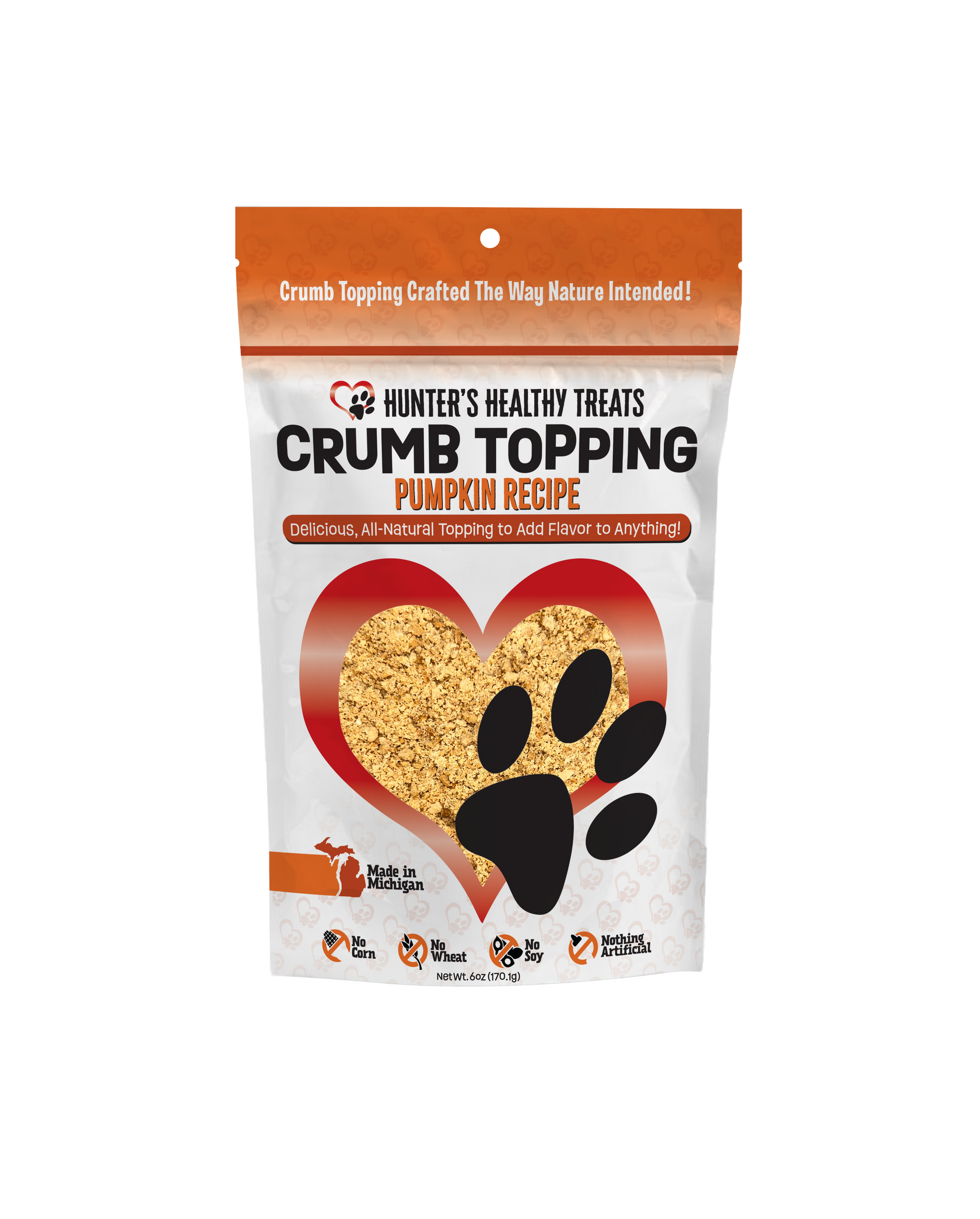 Our all natural pumpkin treats in crumb form. You get the same great healthy ingredients to put on your pet’s food to encourage them to eat. It’s also great on ice cream… theirs or yours!